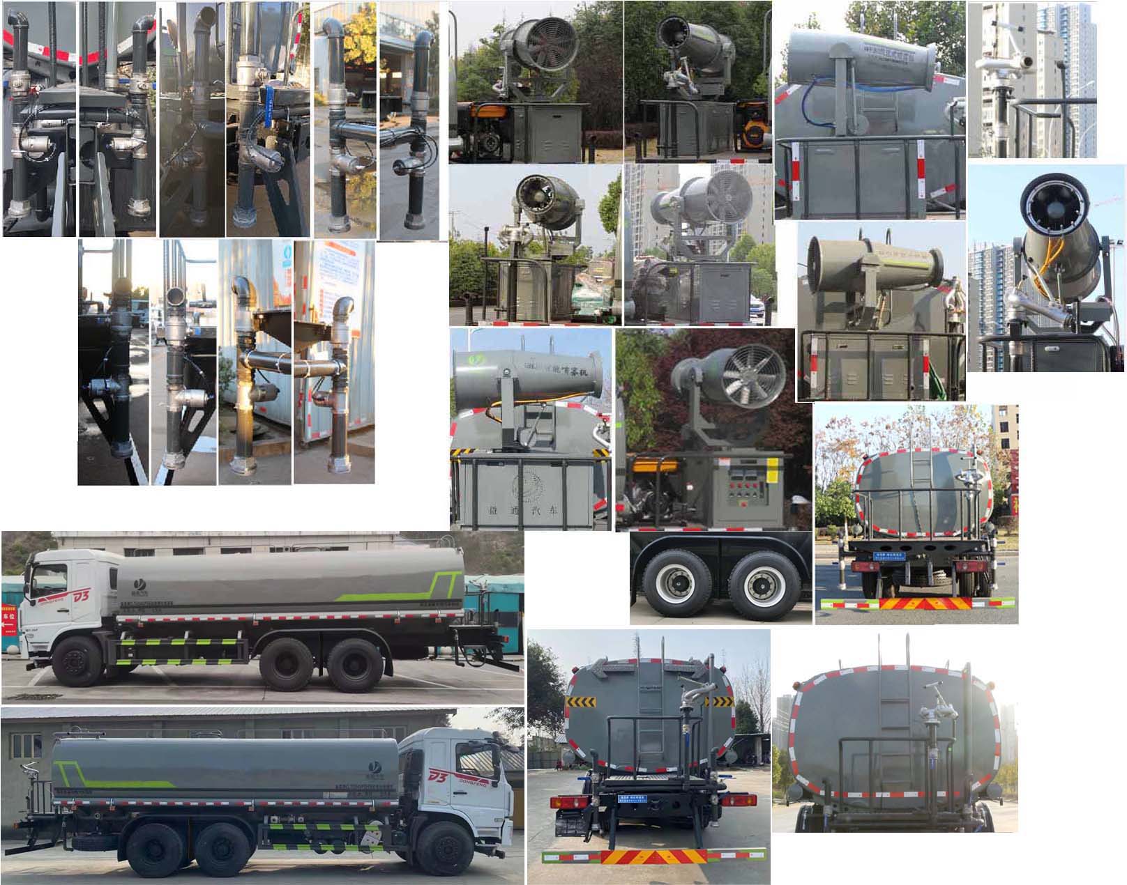 東風20方灑水車.底盤配置: 發動機康明斯 260 馬力(六缸),大同 10 檔變速箱,前橋 5 噸,雙 10 噸后橋,11.00 鋼絲胎,軸距 4350+1350,斷氣剎,ABS,空 調,氣囊座椅,電動玻璃,中控鎖,行駛記錄儀,多功能方向盤