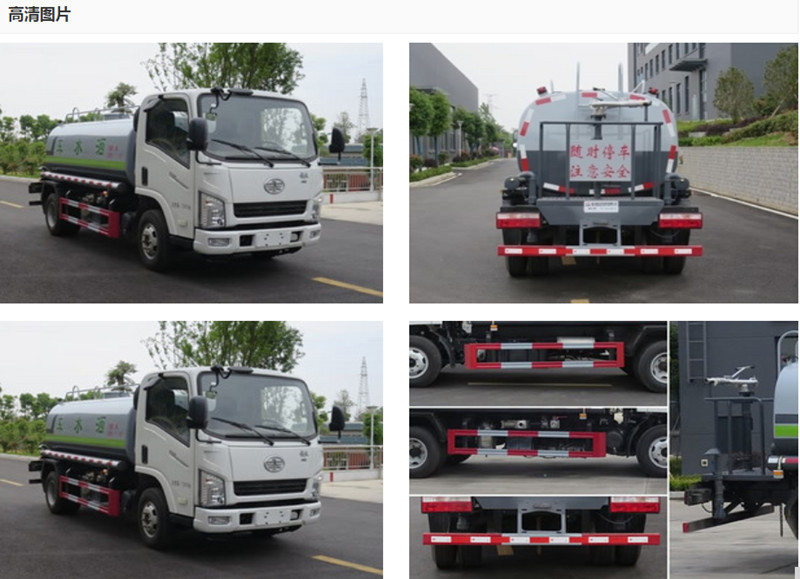 國六解放5噸灑水車,罐體容積5立方米,該車具有免征公告(可免交車輛購置稅)。采用武鋼4mm優質碳鋼板一次卷壓成型,完全做到無縫成型。罐體內設多道防波隔板,采用高壓氣體試漏檢測,使罐體具有強度高,重心穩,車輛運載安全平穩。罐體外表為烤漆,罐體及各保險杠貼紅白色視覺反光條,罐體兩側噴“綠化灑水車”字樣(可按您的要求噴繪字樣),罐體顏色出廠為上白下綠或上白下藍(可按您的要求噴繪顏色)。采用CA1070K2L3E6B底盤,錫柴130馬力發動機,外形尺寸:6200,5995 * 2000 * 2400,2700 (mm),六檔變速箱,總質量(kg) 7360 額定質量(kg) 3930 整備質量(kg) 3300 ,軸距3360mm,配40-50大功率水泵,帶前噴,后灑,側噴,水炮,后工作平臺。