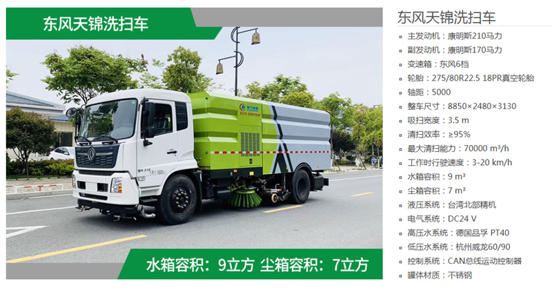 東風天錦國六9方水7方塵洗掃車是我公司自主研發的具有一車多能的新一代清掃設備,具有路面清洗、路面清掃、路緣清洗、路緣和路緣石立面洗刷、低壓沖洗、噴霧降塵等多種功能,可有效提高車 輛的利用率,降低車輛購置費用。適用于城市道路、高速公路、機場、碼頭、遂道、橋梁、隔離墻壁、路緣的機械化清洗、清掃、噴霧降塵等清潔作業。