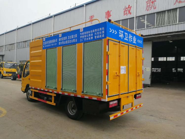 底盤型號:EQ1041SJ3BDF,發(fā)動(dòng)機(jī)玉柴YC4FA115-50,7.00R16鋼絲胎,帶動(dòng)轉(zhuǎn),氣剎,方向助力,整車顏色工程黃。 上裝配置:18.5千瓦電機(jī)1臺(tái),配電柜1臺(tái),4寸排污泵一臺(tái),5.5KW水循環(huán)真空泵1臺(tái),3方高壓水箱,1.5立方液壓絞龍式/滾筒式污水分離箱,帶高壓清洗功能,采用意大利普蘭索特16MPA高壓泵,箱體材質(zhì)采用熱板制作,后部帶LED屏,配工具箱一個(gè)。100mm吸污管4根(每根6米),60米Ф19mm的高壓管,帶10個(gè)噴頭。