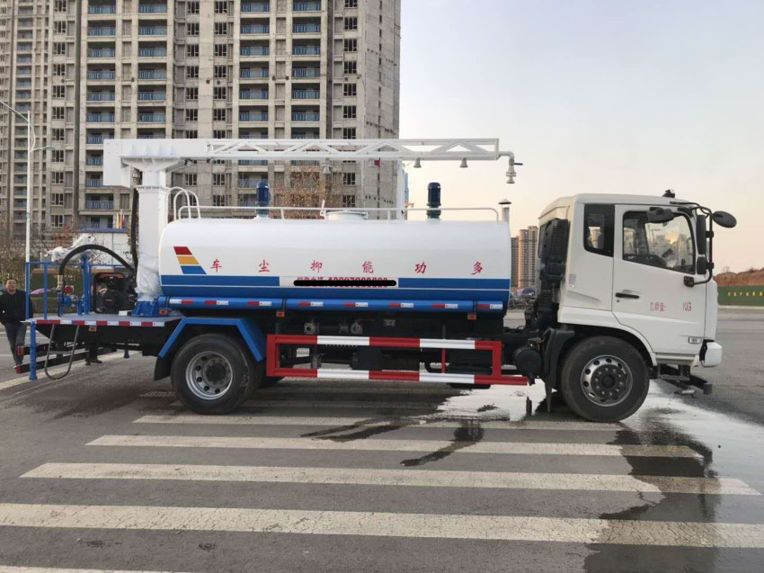 多功能抑塵車主要結構是在行走機構上加裝方型大容積水罐、高效遠程霧炮系統、大功率專用自吸自排水泵,中低壓沖洗灑水系統、綠化灑水高炮(可選裝自動灑水高炮,在罐體前端)等等而改裝組成。、罐體容積大(10-12立方),免征產品。