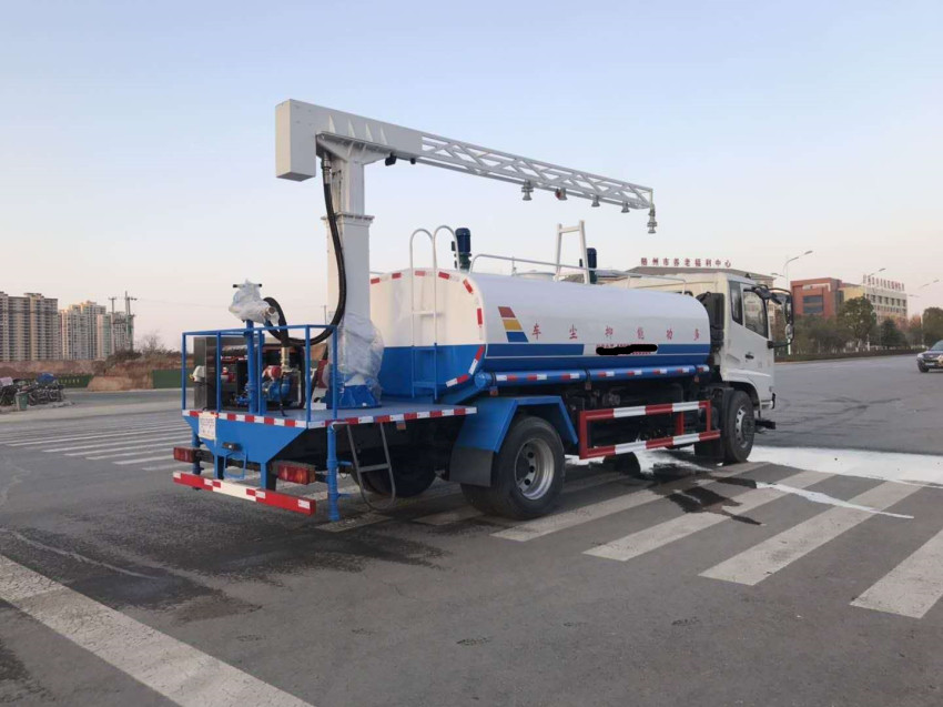 抑塵車上裝配置:罐體為4.5方方形罐,前沖、后灑、側噴、高炮,抑塵噴灑桿(帶旋轉伸縮功能)。噴灑桿離地3.5-4.5米 ,后部平臺帶8KW副發電機組,罐體內部加兩個1.5KW電動馬達(帶攪拌功能)罐體噴漆上白下藍,平臺和噴灑桿藍色。遙控操作噴灑桿上下左右旋轉,電控箱安裝在后部平臺。