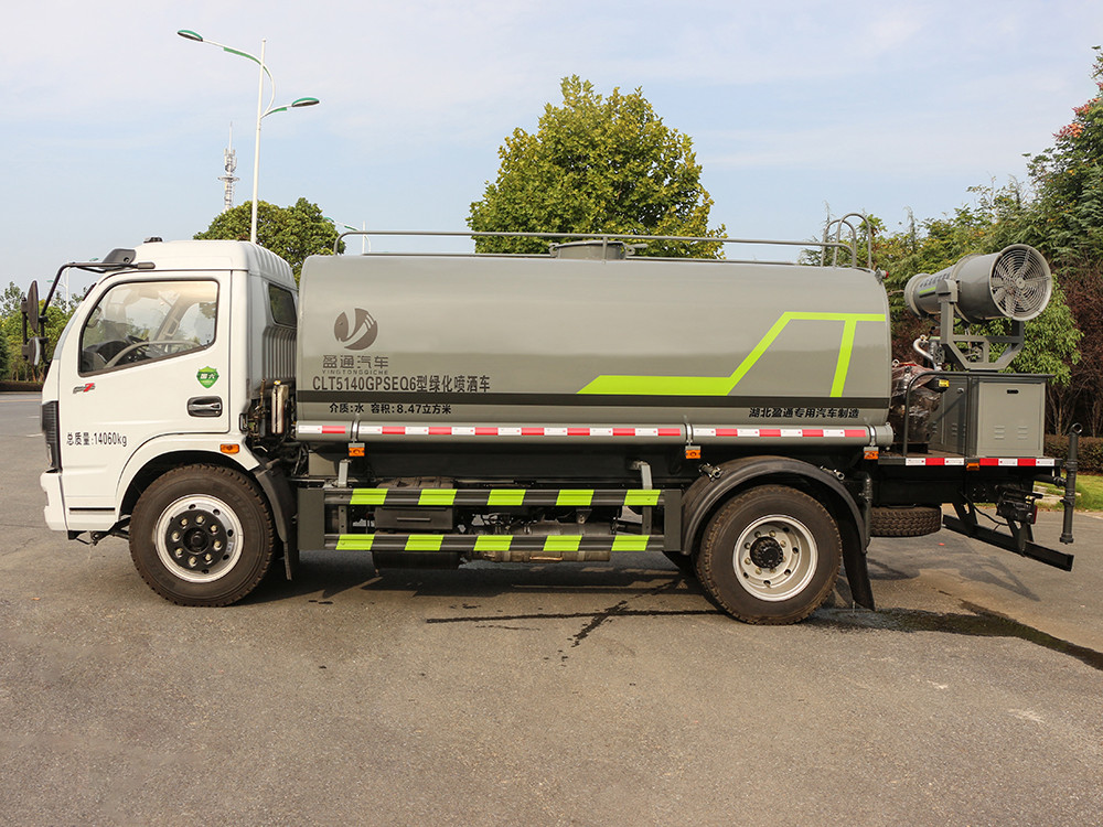 9方抑塵車產品主要技術參數 序號 名稱 型號、規格 1 整車型號 CLT5120GPSEQ6 型綠化噴灑車 2 發動機型號 D30TCIF1 3 發動機馬力/功率 云內 170 馬力/125KW 4 發動機排量 2977ML 5 變速箱 長泰 8 檔 6 輪胎規格 8.25 鋼絲胎 7 軸距 3800 8 總質量 11995KG 9 整備質量 4920KG 10 額定載質量 6880KG 11 整車尺寸(長×寬×高) 7.3*2.25*3 12 罐體容積 9 方 13 燃料種類 柴油 14 排放標準 國六 15 水泵型號 40/50 16 罐體材質 Q235 碳鋼