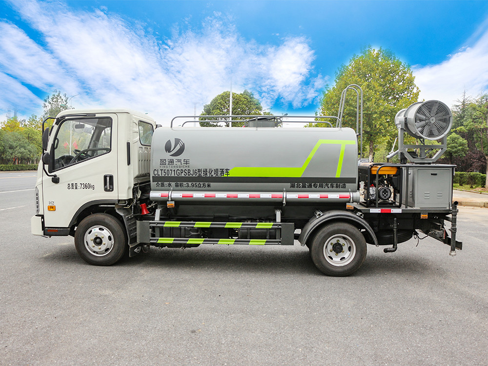 福田H2藍牌5方抑塵車產品介紹產品配置 1.底盤配置: 福田 H2 駕駛室,發動機全柴 130 馬力,法士特 5 檔箱,7.00R16 鋼絲胎,3360 軸距,中控鎖,電動玻璃,T-BOX(全國通用),5T 后 橋,斷氣剎,ABS2.上裝配置: 1、罐體約為 5 方,可加裝 30 型霧炮 2、邊燈帶電,罐體尾部上方標配 2 個紅色示寬燈, 3、標配前噴為鴨嘴直沖,標配后沖,用戶可根據自己的需求,來調 整對沖位置。 4、花紋防滑平臺,炮筒后蓋為定制型螺栓卡扣, 5、前噴、后沖、后灑、側噴,綠化高炮開關球閥均采用 50 大通經 不銹鋼球閥, 6、新式軸承式水炮,更加耐用, 7、40-50 型水泵, 8、防腐法蘭墊片, 9、鋁制后灑,不易炸開 10、罐體自動焊(美國林肯焊機及電源),拼板自動焊接,封頭環 縫焊接,無氣孔,焊縫美觀。 11、側護網、后保險杠、均為螺栓連接,方便拆卸,維修方便。 12、塑料擋泥板,替代鐵擋泥板,更加輕便,用螺栓連接,方便拆 卸。 13、前部、后部主管連接處為 6 孔圓法蘭,不易沖墊